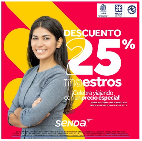 Buen día, por indicaciones de la Secretaria General del Comité Ejecutivo, MCH. Martha Lucía López Almaguer, a través de la Secretaría de Comunicación Social, se remite en archivo adjunto el cartel informativo sobre el descuento ofrecido por Grupo Senda. Verificar que su credencial tenga el holograma vigente. Los maestros jubilados también están incluidos en los descuentos aún cuando el cartel mencione que es para maestros activos.