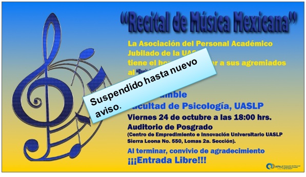 Buen día, la Mesa Directiva de la APAJ les comunica que debido a la situación actual de la UASLP se suspende hasta nuevo aviso el Recital de Música Mexicana.