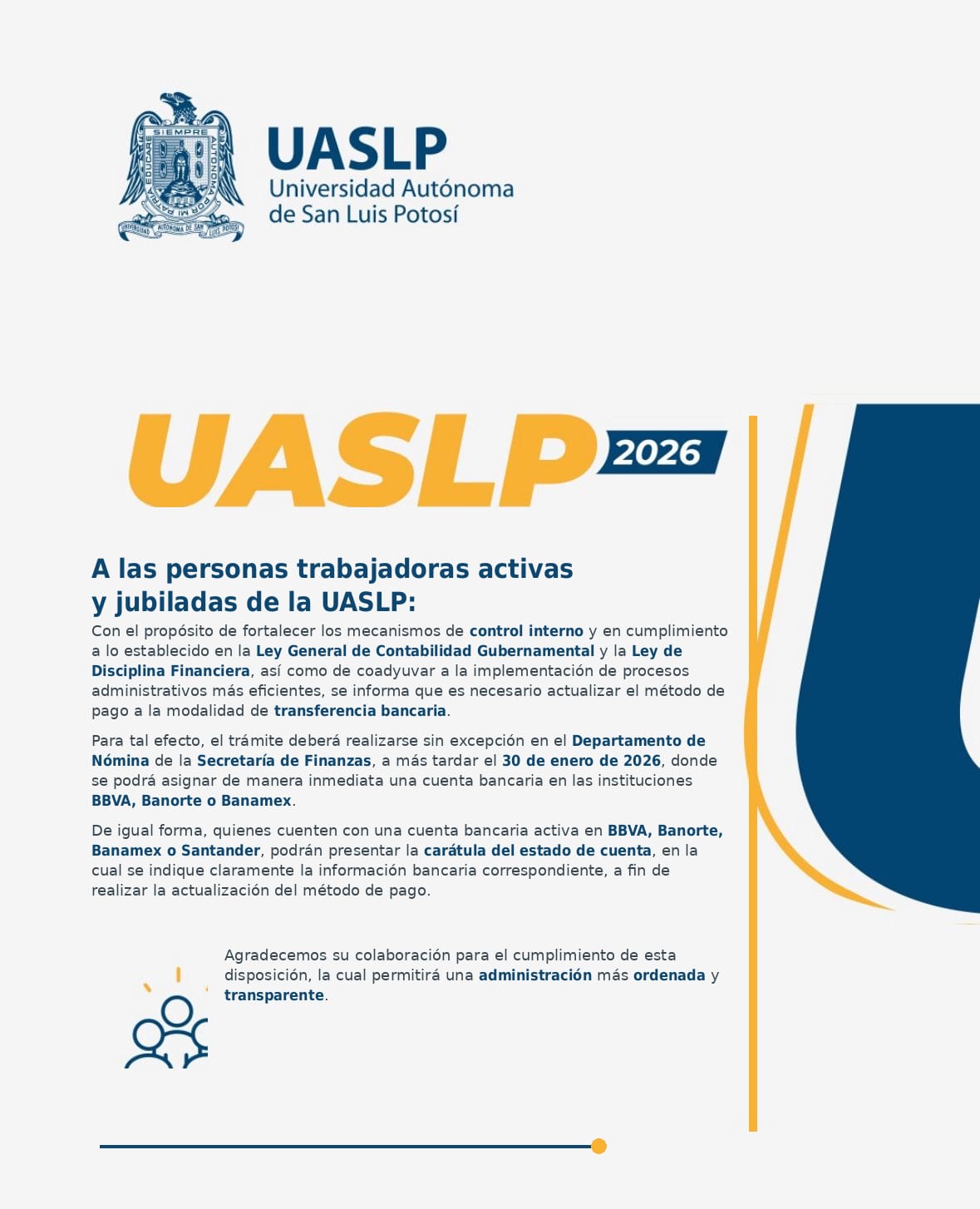 Buen día, la Mesa Directiva de la APAJ les desea un Feliz y Próspero Año 2026 y les recuerda que el comunicado que se envió en Diciembre respecto a la forma de pago de Nómina, se deberá asistir antes del 30 de enero 2026 a la Torre Administrativa en el departamento de Nómina de la Secretaría de Finanzas a presentar la documentación solicitada en el aviso anexo para que su pago de nómina sea depositado en una cuenta bancaria.