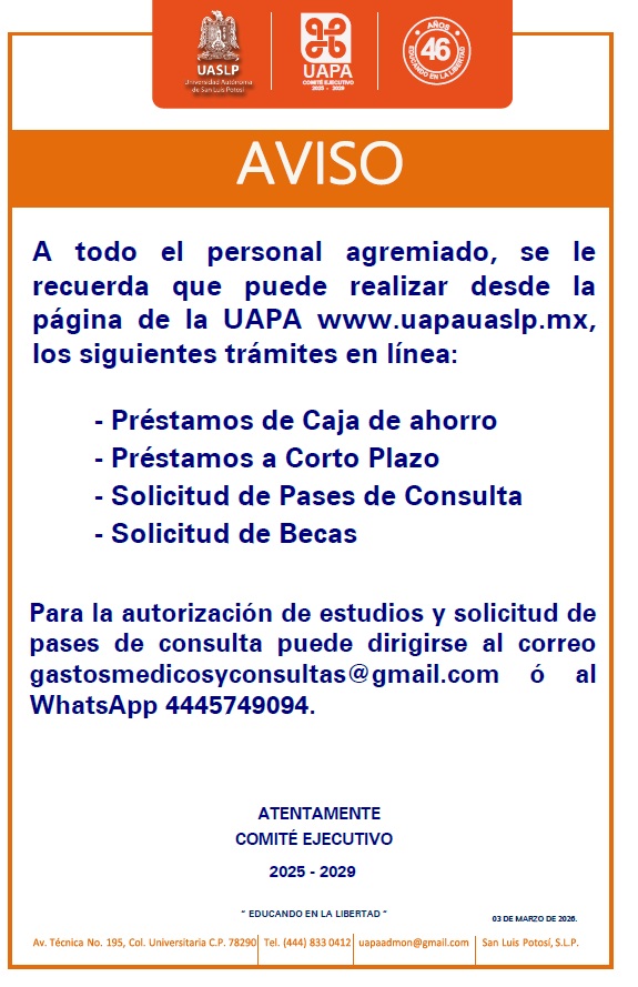 - UAPA-Trámites en línea: Por indicaciones de la Secretaria General del Comité Ejecutivo, MCH. Martha Lucía López Almaguer, se envía en archivo adjunto el aviso de los trámites en línea a través de la página de la UAPA.